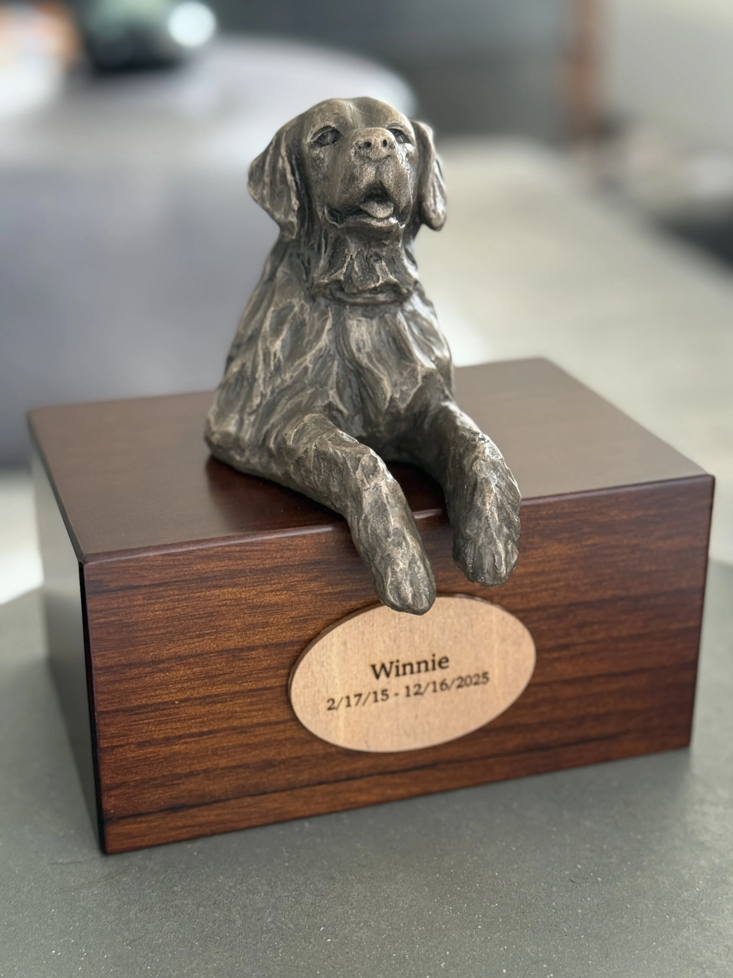 This one-of-a-kind custom urn has a wooden slide out on the bottom of the box to place the ashes. The dog is sculpted in clay and cast in cold cast bronze.